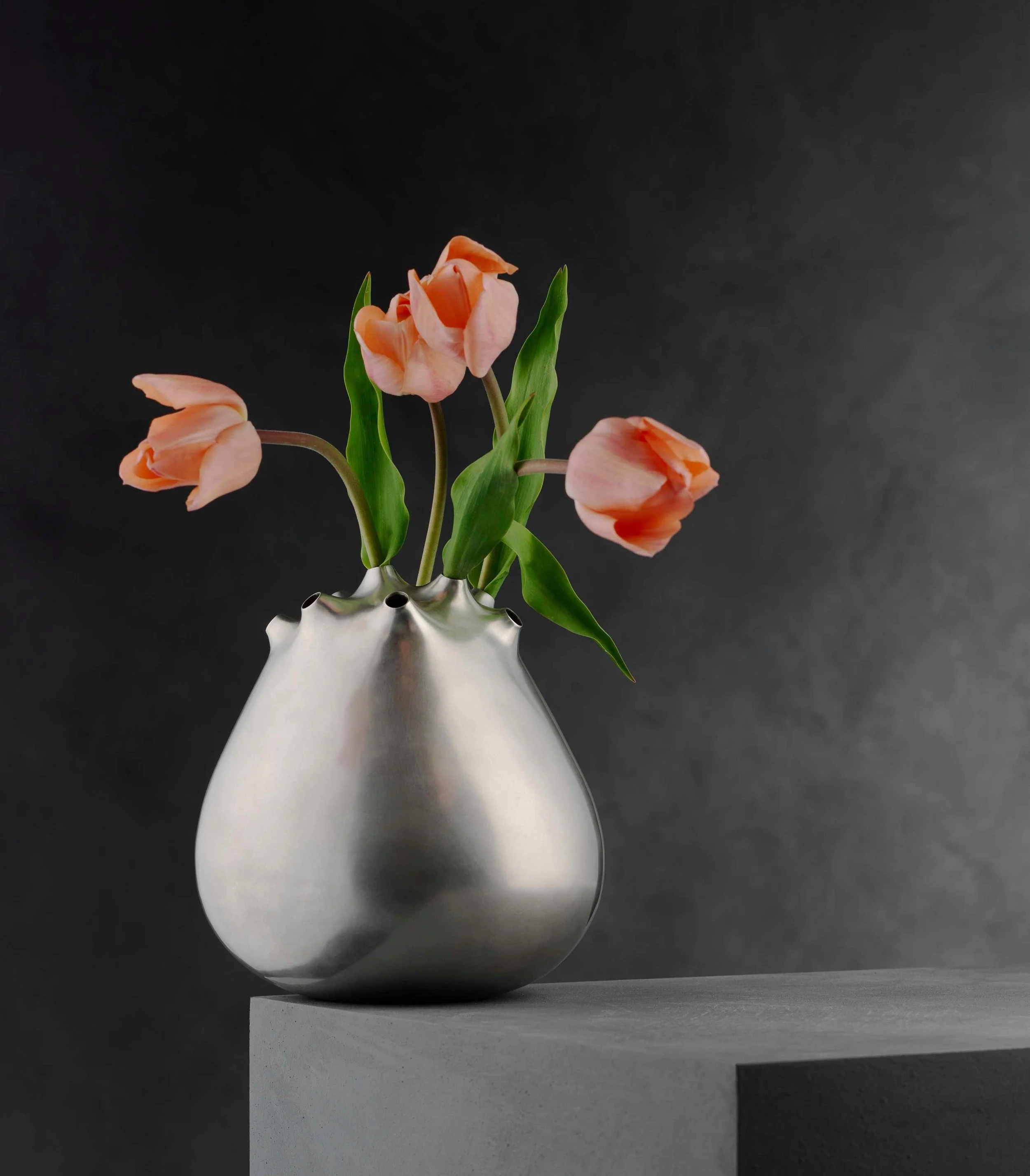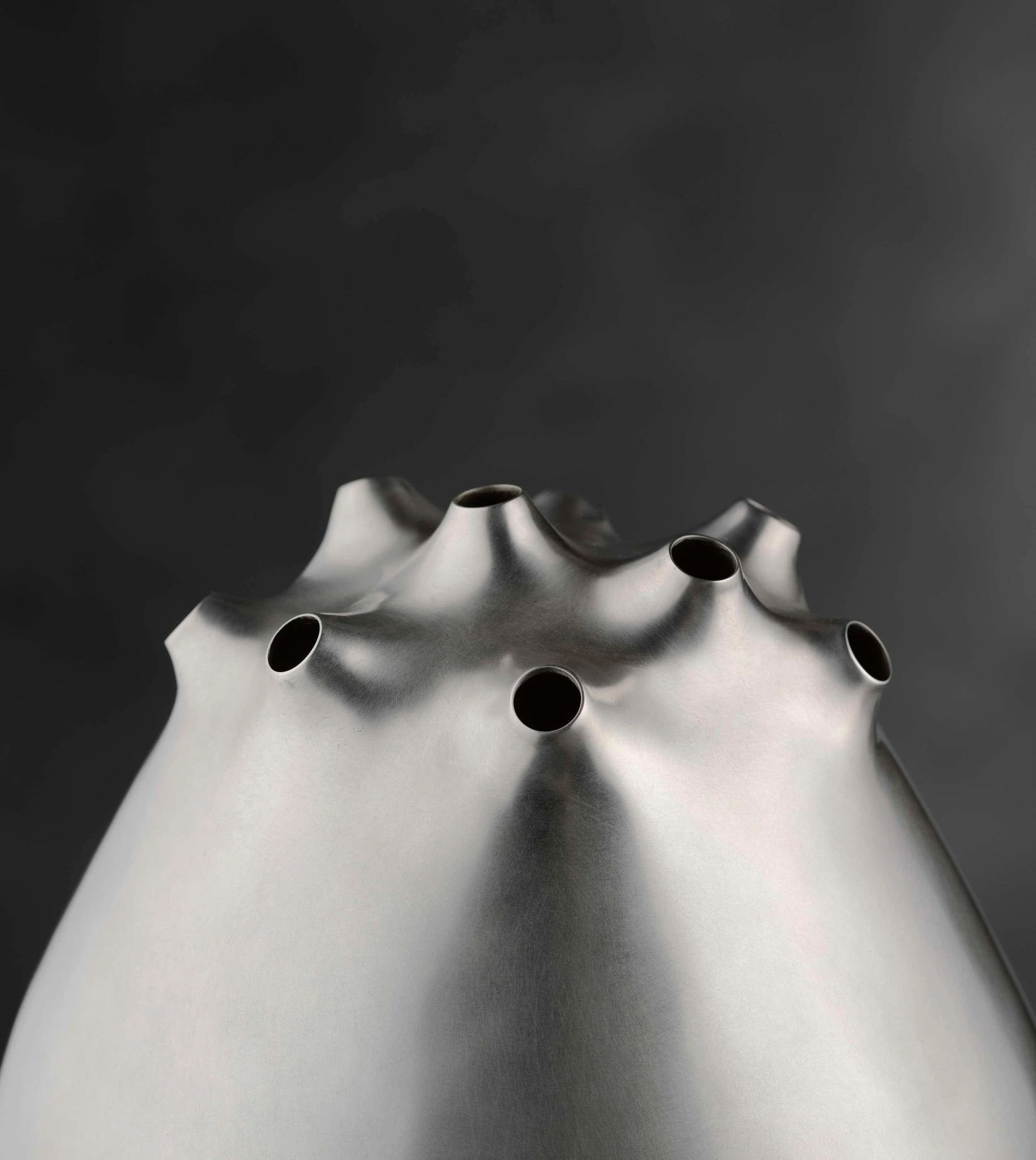 This piece focuses purely on form and function. The flowers placed within the vase are displayed as an extension of its bulbous form, appearing as though they have bud and grown from inside the vase before emerging through each spout.
